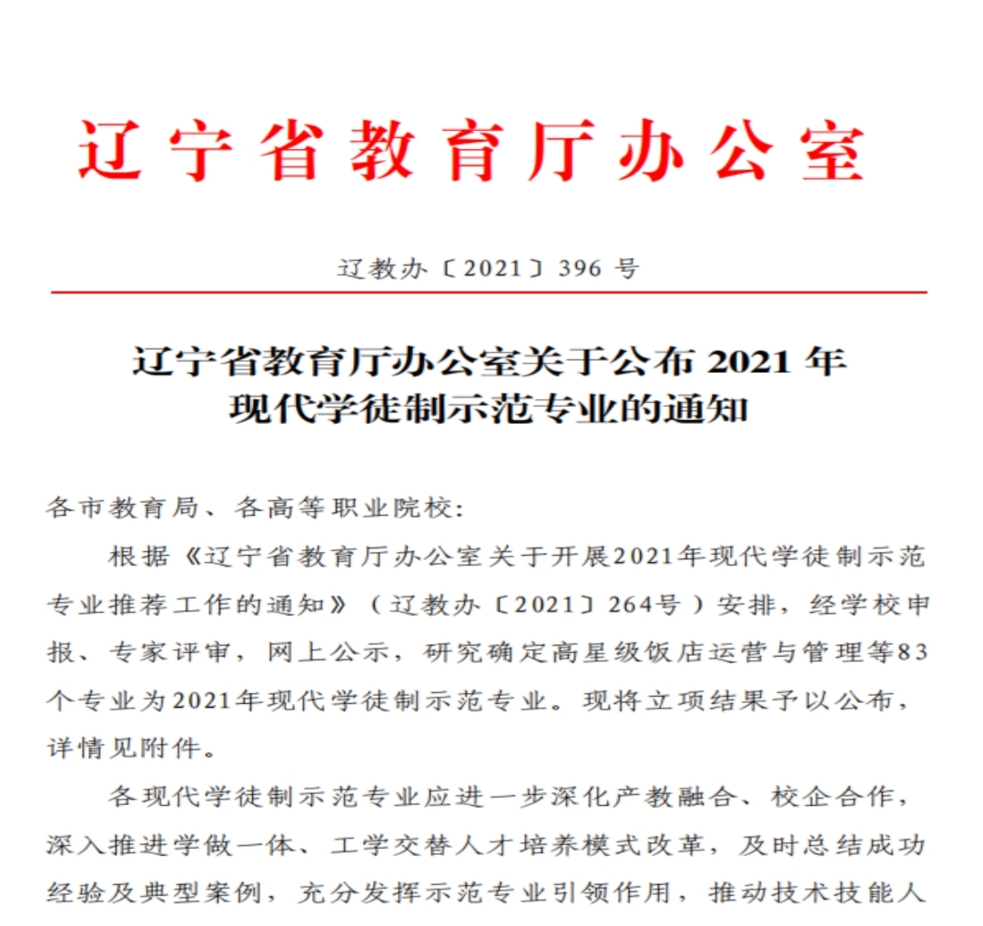 2021年11月11日根據(jù)《遼寧省教育廳辦公室關(guān)于開(kāi)展2021年現(xiàn)代學(xué)徒制示范專業(yè)推薦工作通知》(遼教辦[2021]264號(hào))安排,經(jīng)學(xué)校申報(bào)、專家評(píng)審,網(wǎng)上公示,研究確定83個(gè)專業(yè)為2021年現(xiàn)代學(xué)...