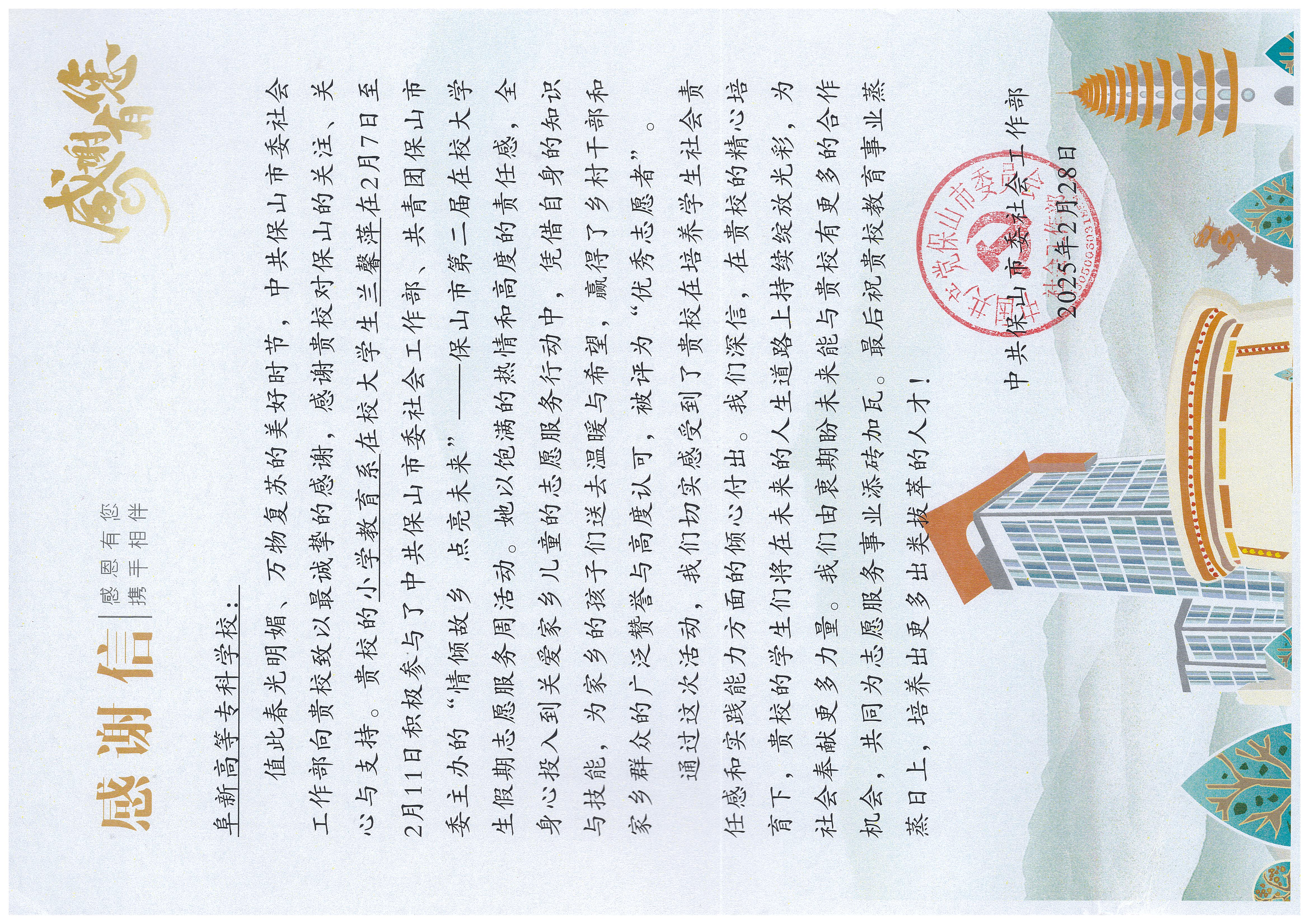 近日,中共保山市委社會(huì)工作部向我校發(fā)來感謝信,對(duì)我校小學(xué)教育系24小教1班蘭馨萍同學(xué)在寒假期間積極參與“情傾故鄉(xiāng) 點(diǎn)亮未來”——保山市第二屆在校大學(xué)生假期志愿服務(wù)周活動(dòng)的突出表現(xiàn)給予高度認(rèn)可,并對(duì)...
