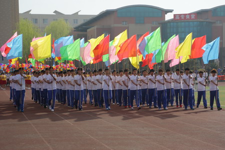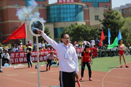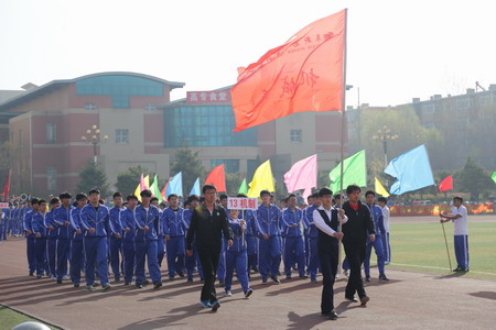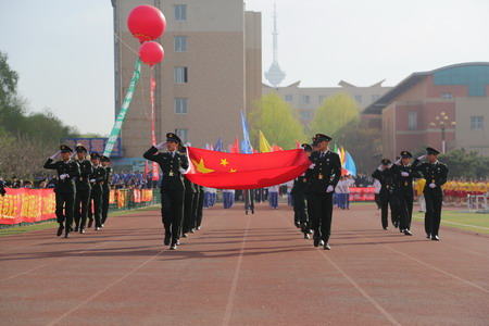 30分,副校長王立宏宣布了運動會正式開幕。在雄壯激昂的《運動員進(jìn)行曲》中,國旗隊、校旗隊、彩旗隊、花束隊、彩球隊、裁判員隊和各系部代表隊依次經(jīng)過主席臺,接受大會的檢閱。整齊的步伐、矯健的身姿,體現(xiàn)出高專師生良好的精神風(fēng)貌和銳意進(jìn)取的拼搏精神。檢閱儀式后,舉行了隆重的升旗儀式,鮮艷的五星紅旗在雄壯的國歌聲中冉冉升起,激起了所有師生的赤子之心和忠義之膽。莊嚴(yán)隆重的升旗儀式過后,校長趙瑞江致開幕詞。他代表學(xué)校黨政領(lǐng)導(dǎo)班子,向精心籌劃本屆運動會的工作人員、教練員們表達(dá)最誠摯的謝意;向全體運動員、裁判員致以最親切的問候和衷心的祝愿,祝愿學(xué)子實現(xiàn)青春夢想,擁抱青春年華,做一名德、智、體、美、勞全面發(fā)展的好青年,并預(yù)祝運動會圓滿成功。隨后,體育教學(xué)部教師周海瑞代表全體裁判員宣誓,表示要嚴(yán)格遵守時間,遵守比賽規(guī)程,履行裁判員的職責(zé),做到公平、公正、公開。學(xué)生代表趙海林代表全體運動員宣誓,表示要遵守比賽規(guī)則、聽從指揮、服從裁判、團結(jié)協(xié)作、公平競技、賽出水平、賽出風(fēng)格。