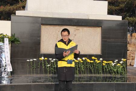 7點40分,祭掃活動開始,由學(xué)生代表向革命烈士紀(jì)念碑敬獻(xiàn)花籃表達(dá)對革命英烈的緬懷。隨后,16級導(dǎo)游學(xué)生朱佳琳講解紀(jì)念碑的由來及寓意,人文系團(tuán)總支副書記劉慕睿作為學(xué)生干部代表在發(fā)言中倡導(dǎo)大家銘記歷史,肩負(fù)起振興中華的責(zé)任;校青年志愿者服務(wù)隊代表戴天賜呼吁青年志愿者們要以“奉獻(xiàn)、友愛、互助、進(jìn)步”為口號,秉承“愛心獻(xiàn)社會,真情暖人間”的精神,做好志愿服務(wù)。
