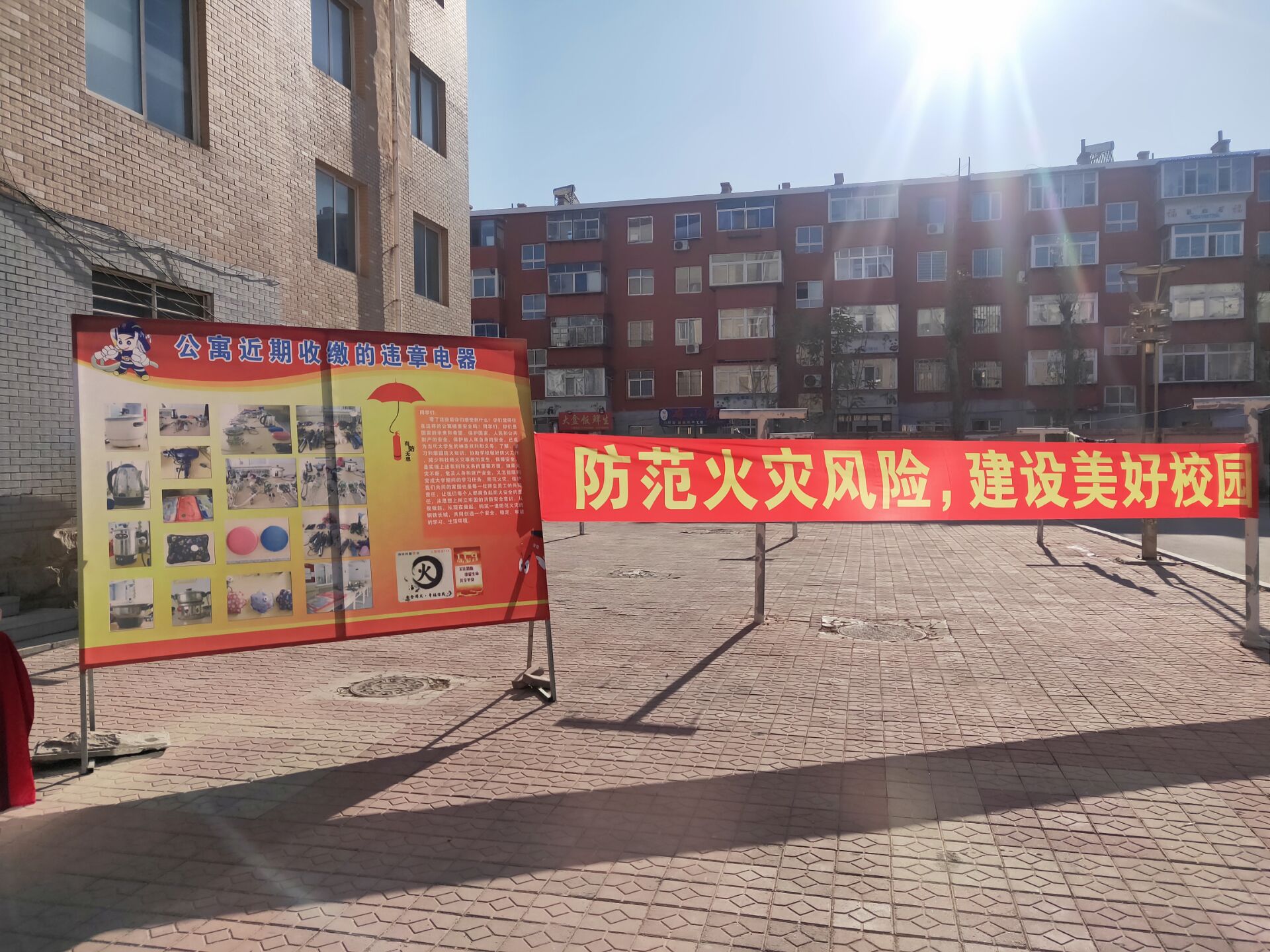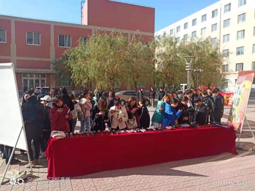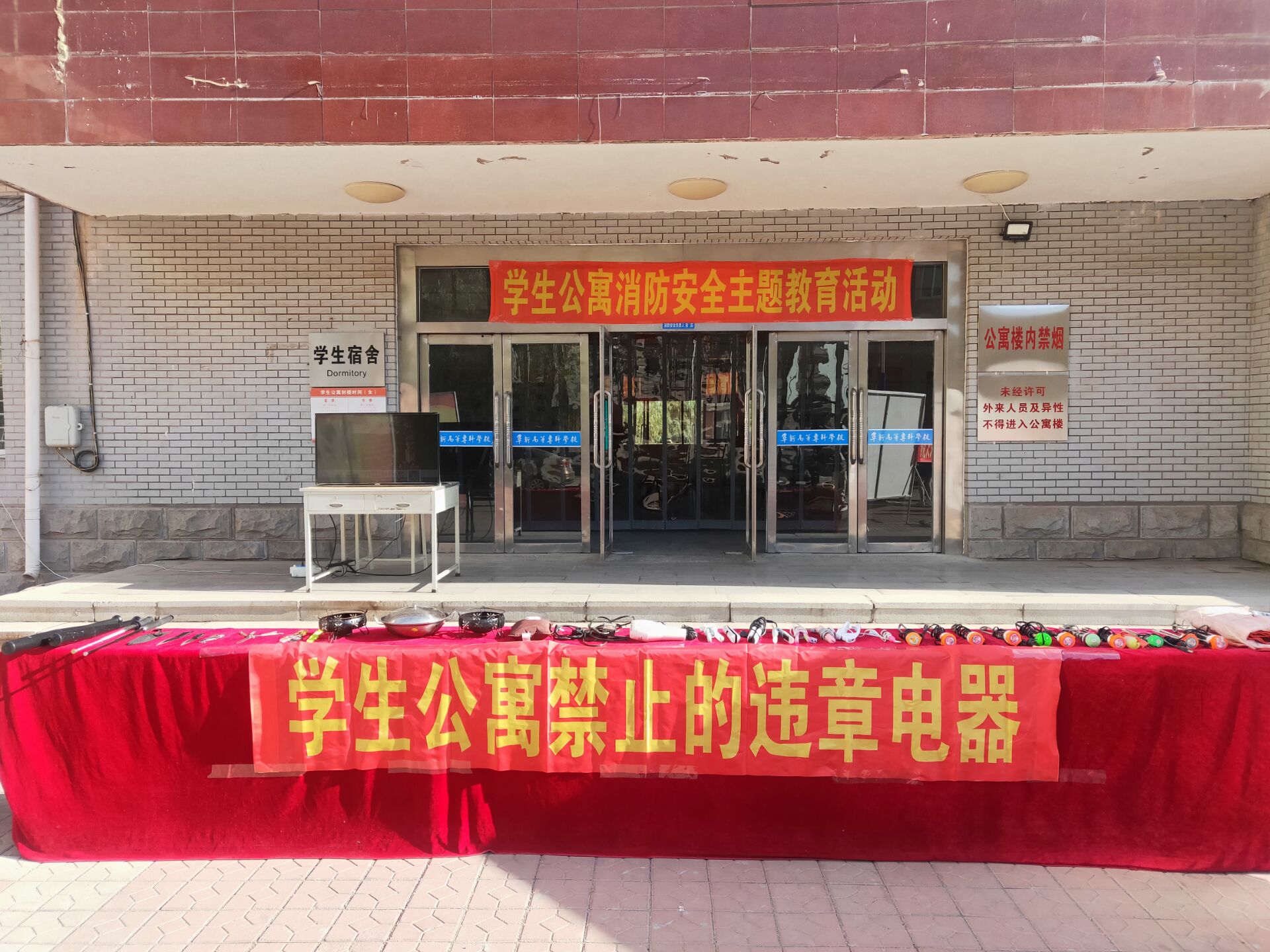 活動現(xiàn)場展示了近些年來諸多高校學(xué)生公寓因違規(guī)使用電器而導(dǎo)致的火災(zāi)事故案例和近期公寓收繳的違章電器、管制刀具等,并在現(xiàn)場懸掛了宣傳橫幅,用電子屏幕循環(huán)播放了消防安全知識、火場逃生技能以及消防器材使用方法等宣傳視頻,同時學(xué)生公寓老師和舍務(wù)干部為住宿生發(fā)放了消防知識宣傳材料。整個活動過程中,同學(xué)們都認(rèn)真學(xué)習(xí),并用手機(jī)拍攝了照片和視頻。