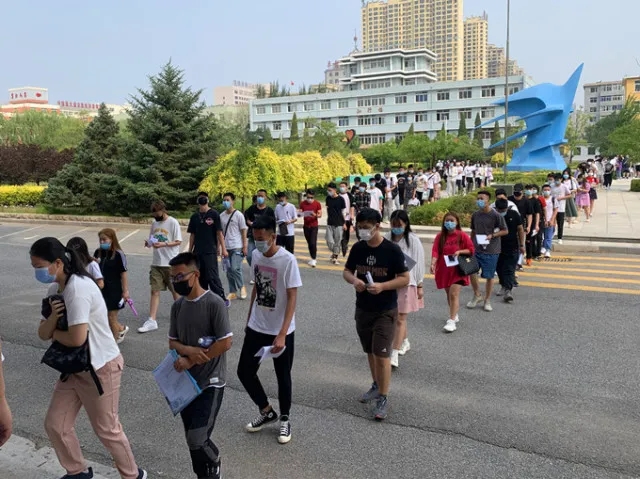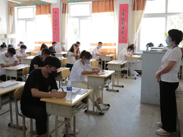 考生有序進(jìn)入考場(chǎng),保持安全距離,監(jiān)考教師佩戴口罩監(jiān)考