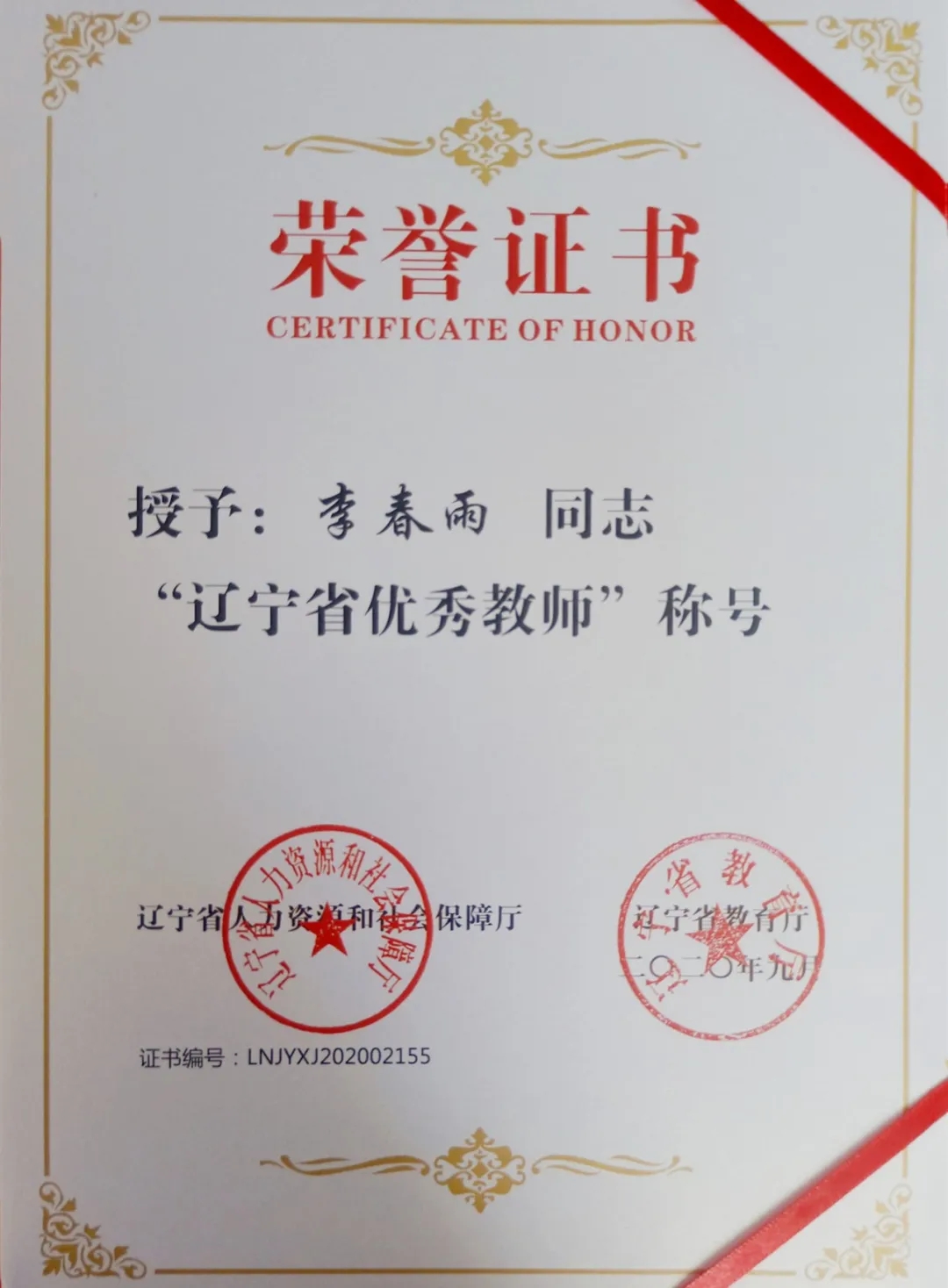 芬芳杏壇,潤澤桃李。在慶祝第36個(gè)教師節(jié)之際,為在全社會(huì)弘揚(yáng)尊師重教的良好風(fēng)尚,進(jìn)一步激勵(lì)廣大教師和教育工作者獻(xiàn)身教育事業(yè),吸引優(yōu)秀人才投身教育事業(yè),建設(shè)一支高素質(zhì)的教師隊(duì)伍和教育管理干部隊(duì)伍,推動(dòng)教育事業(yè)又好又快發(fā)展,9月9日,在全省慶祝2020年教師節(jié)暨“遼寧省教育系統(tǒng)先進(jìn)集體和先進(jìn)個(gè)人”表彰大會(huì)上,我校教務(wù)處處長李春雨同志榮獲“遼寧省優(yōu)秀教師”稱號(hào)。