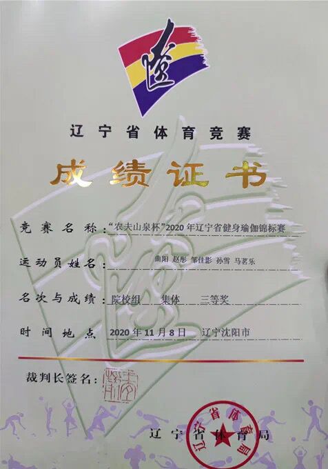 11月7-8日,由遼寧省體育總會主辦,遼寧雷諾體育文化傳播有限公司承辦的“農(nóng)夫山泉杯”2020年遼寧省健身瑜伽錦標賽在沈陽隆重舉行。來自師范系的五名學生曲陽,趙彤,鄒佳影,馬茗櫟,孫雪,通過激烈的角逐和不懈的努力,取得了院校組集體三等獎,周海瑞和杜蘭杰兩位教練員獲得優(yōu)秀教練員稱號。