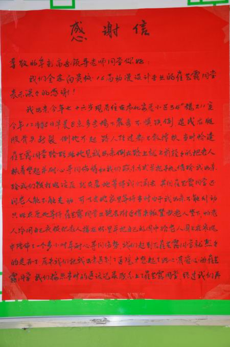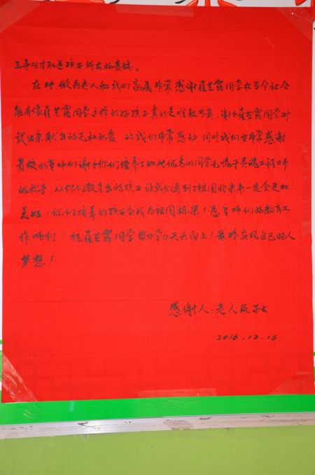 12月16日,老人的兒女們輾轉找到了做好事不留名的00后女孩崔藝露,并用紅紙寫了一封感謝信送到了阜新高等??茖W校表達感激之情。