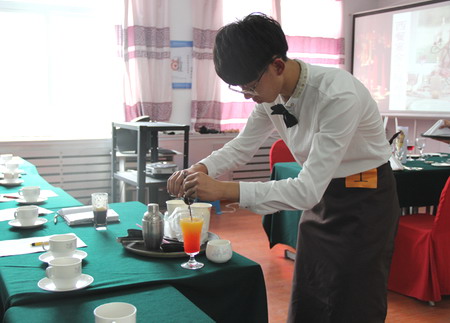 本次比賽考察了14酒店班選手們的西餐宴會服務(wù)的專業(yè)技能和實踐創(chuàng)新能力。選手們身著西餐廳專業(yè)服裝,用流利的英語迎賓,擺臺姿勢優(yōu)雅,設(shè)計以意大利狂歡節(jié)、西方古典音樂、俄羅斯風(fēng)情、足球世界杯為主題的宴會,并向評委們推介了德國菜、意大利菜、法國菜和圣誕節(jié)、感恩節(jié)、復(fù)活節(jié)的特色菜肴,現(xiàn)場調(diào)制了12款不同的雞尾酒,如莫吉多、紅色馬蒂尼、特基拉日出、綠色幻想曲等。