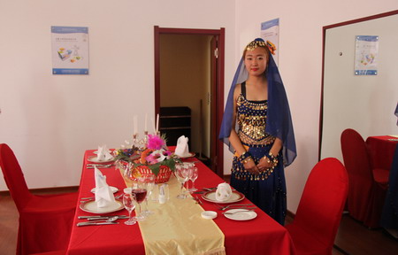 比賽由西餐宴會擺臺、斟酒、餐巾折花、宴會主題及菜單設(shè)計、雞尾酒調(diào)制和禮儀展示等環(huán)節(jié)組成。一桌桌美輪美奐、銀光閃閃的西餐宴會擺臺令人贊不絕口;一杯杯色彩繽紛、香醇誘人的調(diào)酒作品令人嘆為觀止;一張張設(shè)計考究、色味俱全的西餐菜單令人仿佛置身國外的餐廳,琳瑯滿目的主題裝飾品和芬芳馥郁的插花,使整個比賽現(xiàn)場顯得美麗而又醉人。