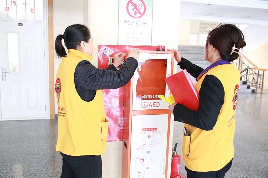 44日,負責(zé)此次捐贈活動的阜新玉龍服務(wù)隊隊長馬明杰帶領(lǐng)隊員到我校尚學(xué)樓一樓正廳進行AED設(shè)備安裝。