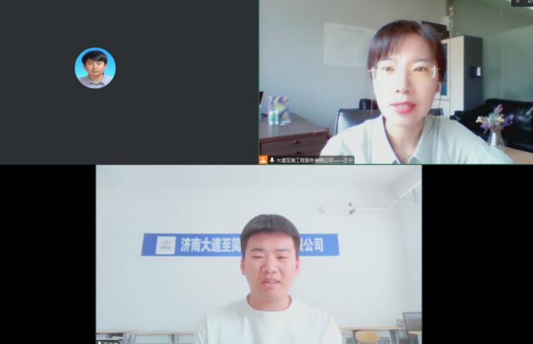 5月19日下午,我系與濟南大道至簡工程服務有限公司在致遠樓2506舉行了線上招聘會,此次招聘會主要面向2024屆學生。公建系主任王浩,濟南大道至簡工程服務有限公司人事經(jīng)理王寧,就業(yè)聯(lián)絡(luò)員孫洪凱以及2024屆10余名學生參加了會議。