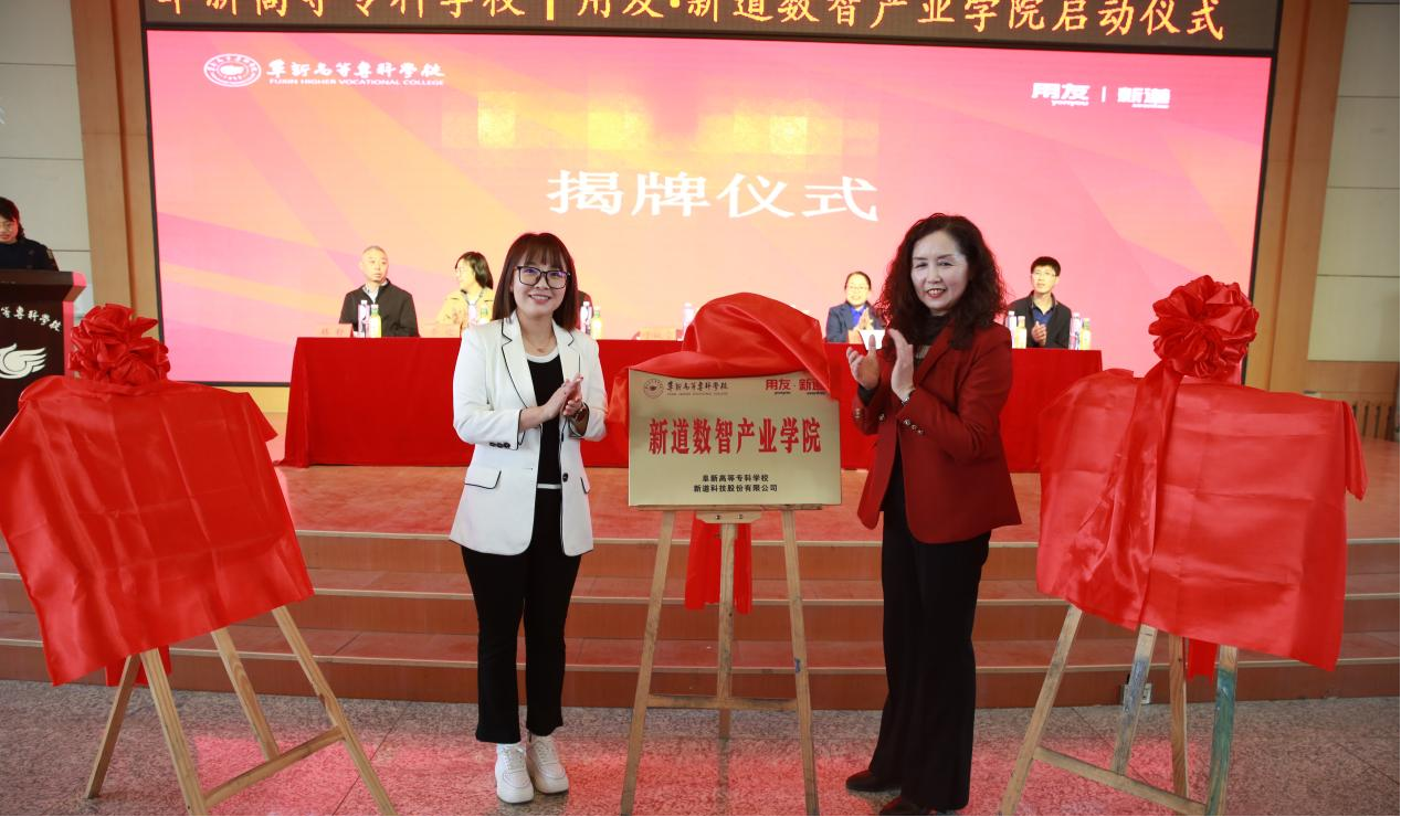在熱烈的掌聲中,呂東春校長(zhǎng)與于曉蕾總代表校企雙方簽訂了合作協(xié)議,并共同為“阜新高等專科學(xué)校|用友·新道數(shù)智產(chǎn)業(yè)學(xué)院”揭牌。