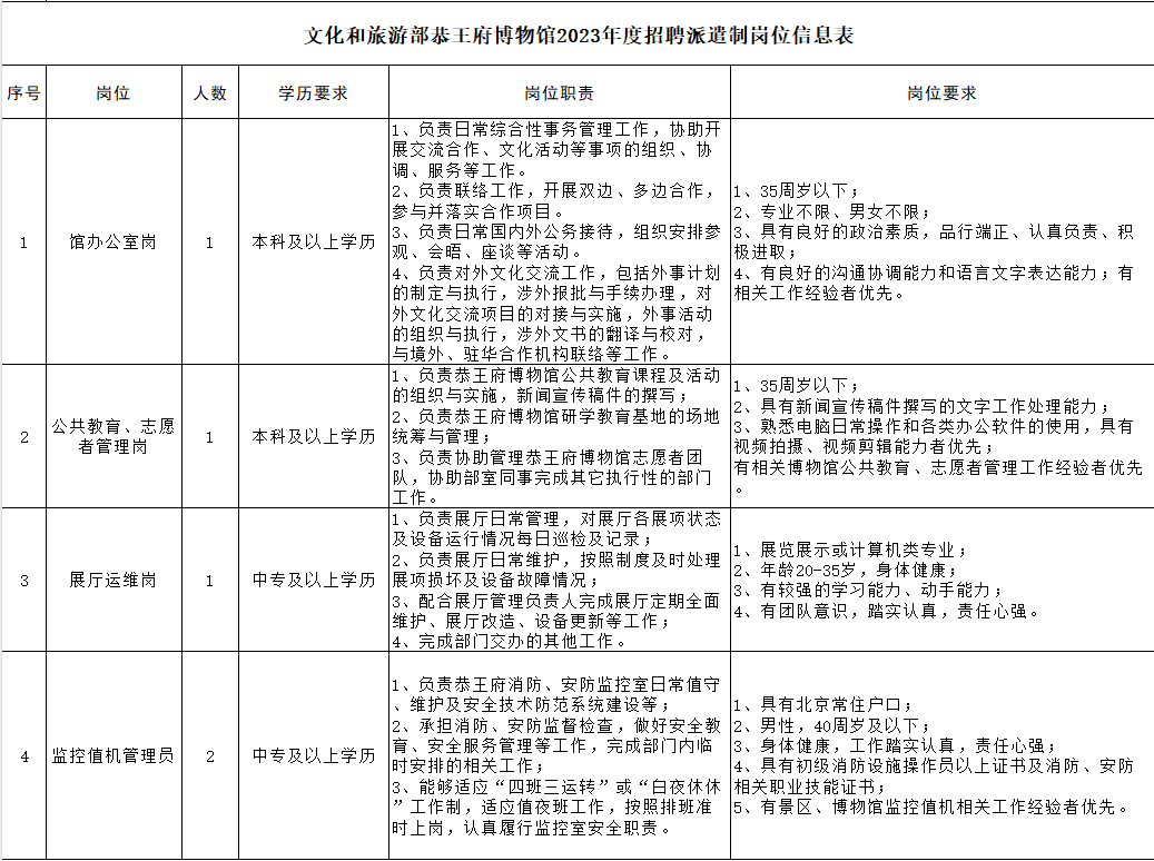 文化和旅游部恭王府博物館2023年度派遣制工作人員公開招聘公告