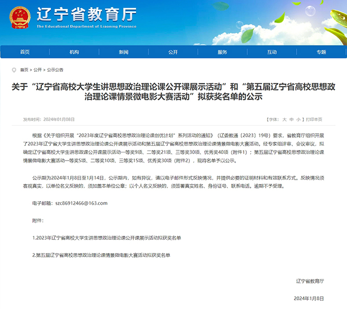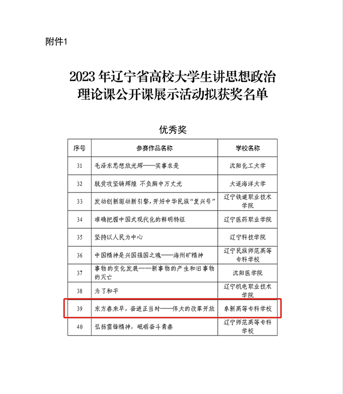 日前,遼寧省教育廳公布了關(guān)于“遼寧省高校大學(xué)生講思想政治理論課公開課展示活動(dòng)”和“第五屆遼寧省高校思想政治理論課情景微電影大賽活動(dòng)”擬獲獎(jiǎng)名單的公示。由我校思想政治教學(xué)部岳鳳嬌老師專業(yè)指導(dǎo),我系學(xué)生馬駿馳主講的《東方春來早,奮進(jìn)正當(dāng)時(shí)——偉大的改革開放》榮獲優(yōu)秀獎(jiǎng)。