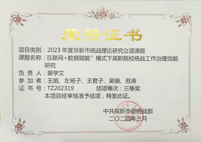 近日,阜新市委統(tǒng)戰(zhàn)部通報(bào)了2023年全市統(tǒng)一戰(zhàn)線各項(xiàng)工作評(píng)選表彰情況。我校裴學(xué)文老師主持的統(tǒng)戰(zhàn)理論研究課題《“互聯(lián)網(wǎng)+數(shù)據(jù)賦能”模式下高職院校統(tǒng)戰(zhàn)工作治理效能研究》獲全市統(tǒng)戰(zhàn)理論政策研究創(chuàng)新成果三等獎(jiǎng)。