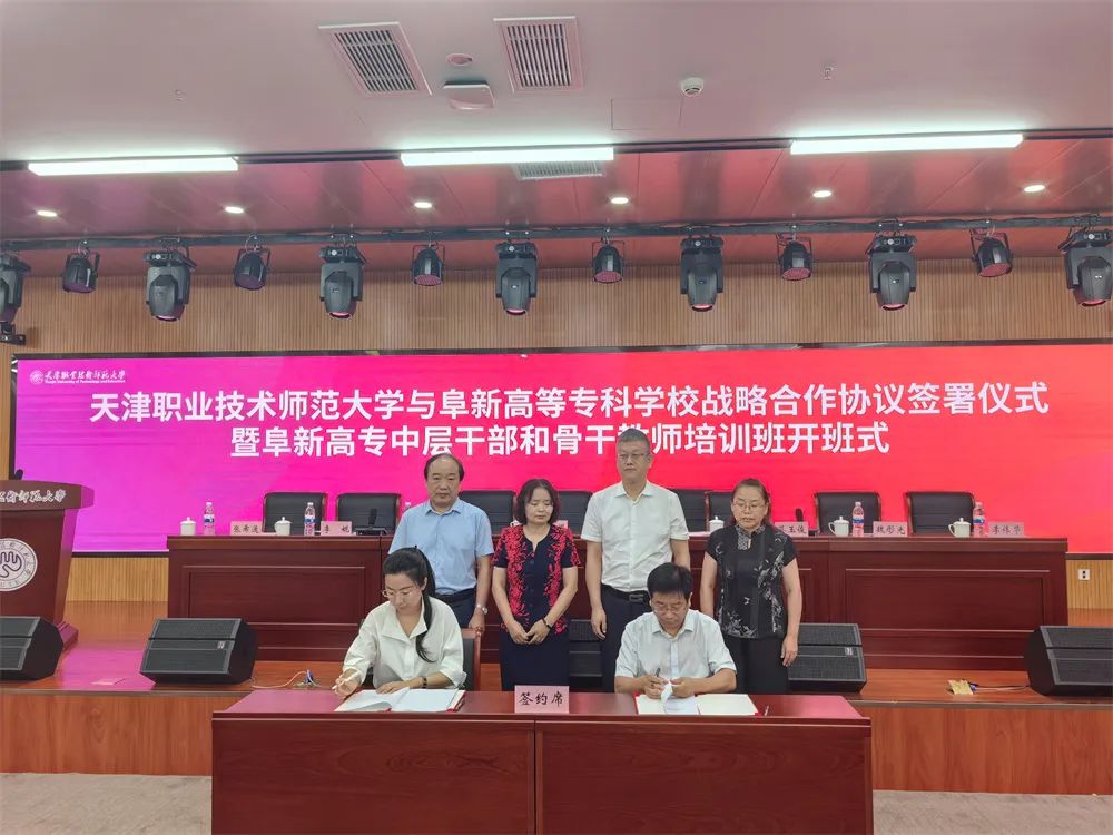 為了及時更新職業(yè)教育理念,緊扣時代脈搏,我校積極加強與省內(nèi)外優(yōu)質(zhì)院校的合作交流,于8月5日與天津職業(yè)技術(shù)師范大學(xué)簽署了戰(zhàn)略合作協(xié)議,籌劃在人才培養(yǎng)、師資培訓(xùn)、專業(yè)建設(shè)、技能大賽、學(xué)科科研等多個領(lǐng)域開展合作。并于8月5日--10日成功舉辦了57位干部教師的中層干部和骨干教師能力素養(yǎng)培訓(xùn)班,積極推動我校師資隊伍建設(shè)和辦學(xué)水平提升,為我市實施全面振興新突破三年行動提供堅實的人才支撐。 天津職業(yè)技術(shù)師范大學(xué)黨委副書記、校長鄭清春,黨委常委、副校長蔡玉俊,阜新市委教育工委副書記、市教育局黨組書記、局長陳曉娟,阜新高等??茖W(xué)校黨委書記王海新、副校長李妮、副校長魏彤光出席簽約儀式,阜新高等專科學(xué)校57名中層干部和骨干教師參加了簽約及開班典禮。