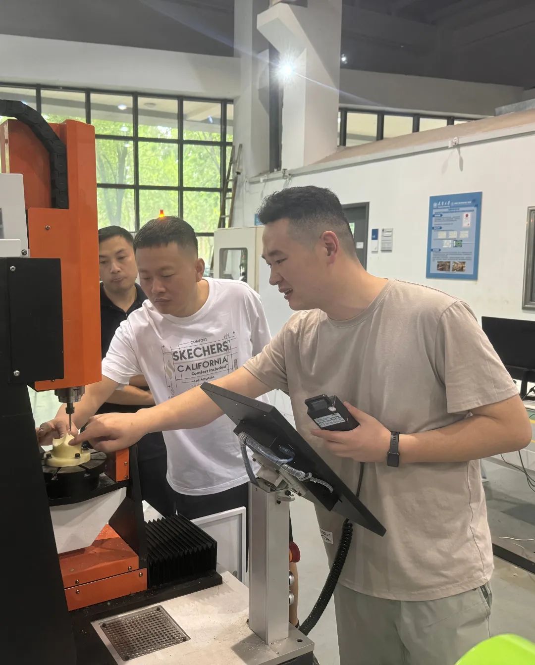 在天職師大培訓(xùn)的同時,我校還選派裝備制造教師團(tuán)隊赴天津大學(xué)天大精益工訓(xùn)中心參加了五軸加工及數(shù)字孿生應(yīng)用培訓(xùn)。此次培訓(xùn)聚焦于前沿的五軸加工技術(shù)及其在加工中心上的創(chuàng)新應(yīng)用,同時深入探討了數(shù)字孿生技術(shù)在現(xiàn)代制造業(yè)中的重要作用。參訓(xùn)教師在專家指導(dǎo)下,親自上手操作五軸車床,通過不斷實踐與調(diào)試,成功設(shè)計并精準(zhǔn)加工出渦輪機構(gòu)等精密零件,切實提升了教師的專業(yè)技能水平,為我校教育教學(xué)更好的適應(yīng)產(chǎn)業(yè)需求奠定基礎(chǔ)。
