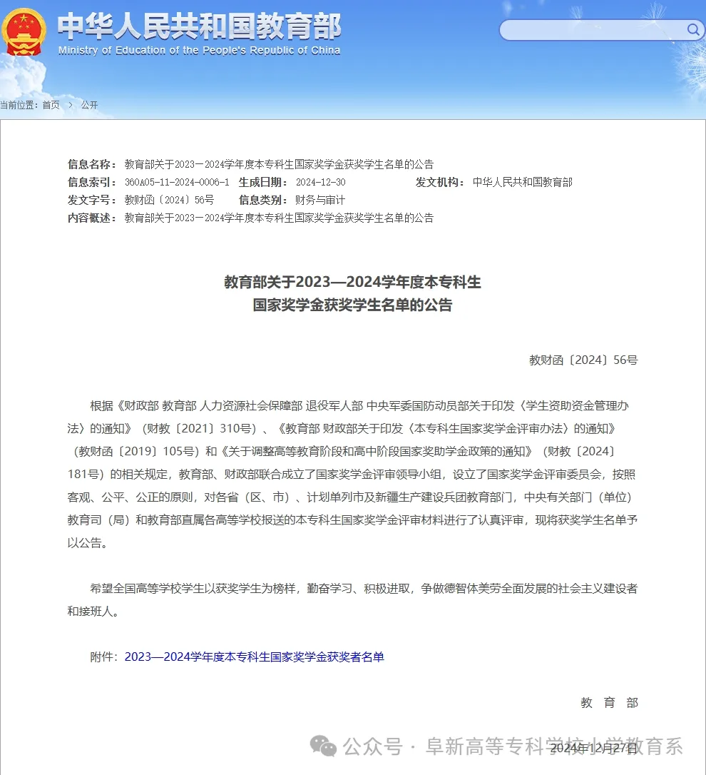 近日,教育部官網(wǎng)發(fā)布《關(guān)于2023—2024學(xué)年度本??粕鷩要剬W(xué)金獲獎學(xué)生名單的公告》,公布獲獎學(xué)生名單中,我系22小教1班孟祥玉同學(xué)上榜。