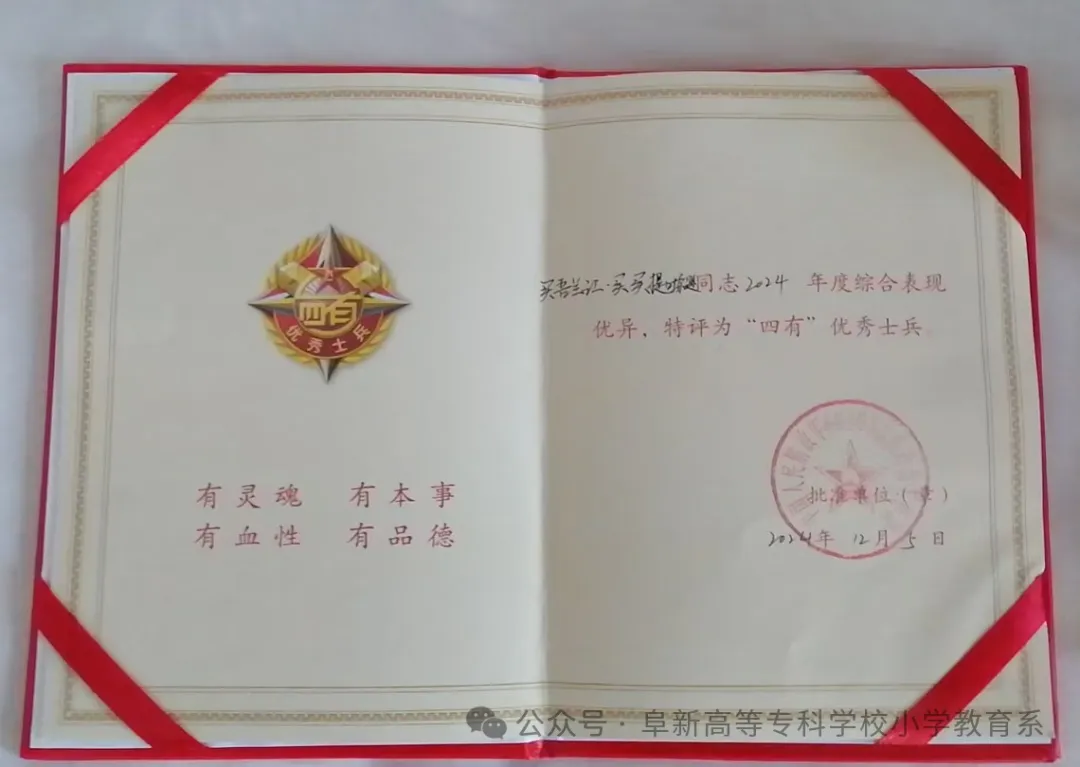 2024年11月,因綜合表現(xiàn)優(yōu)異,獲部隊嘉獎,被授予“四有”優(yōu)秀士兵稱號。