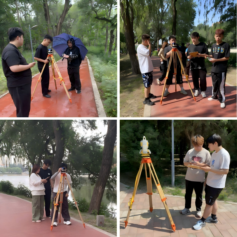 實訓過程中,教師詳細講解測量任務要點、安全規(guī)范和相關實訓要求,學生們以小組為單位,攜帶水準儀、全站儀等專業(yè)設備,穿梭于公園的坡地、廣場與林間。學生們嚴格按照測量規(guī)范,反復校準儀器、記錄數據、閉合差計算,力求毫米級精度;導線測量中,各小組協同配合,完成選點、測角、量邊等一系列操作,將課堂所學的誤差調整、平差計算等理論知識,精準應用于實際測量工作。
