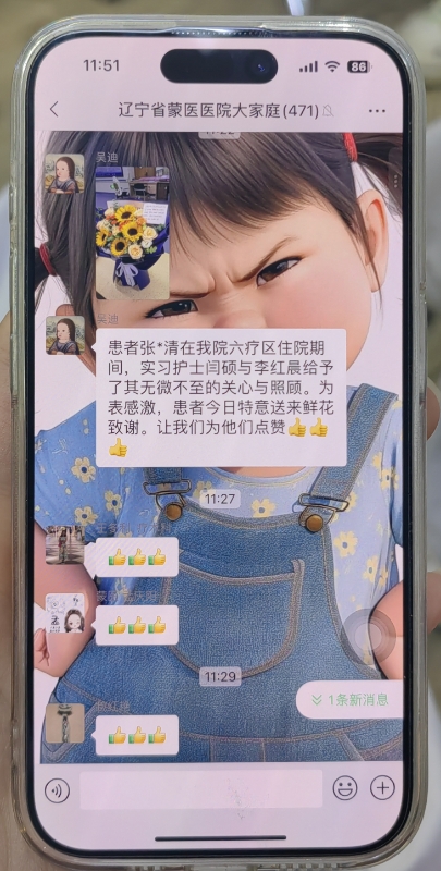 我校護理專業(yè)的19名學生是今年7月10日起在遼寧省蒙醫(yī)醫(yī)院開始崗位實習的。在實習期間,閆碩、李紅晨兩位同學虛心向帶教老師請教,在臨床護理中始終以嚴謹?shù)膽B(tài)度對待每一項操作,精準完成各項護理任務;她們細致觀察患者病情變化,及時反饋溝通,為診療提供了有力支持;她們傳遞護理溫度,用溫暖的話語和貼心的照護讓患者在治療期間感受到了家人般的關愛。患者及家屬的由衷贊譽,“特別致謝實習生”的舉動,不僅是對閆碩、李紅晨兩位同學個人努力的最好嘉獎,更折射出我?!靶薜碌Z能”校訓精神在實踐中的生動綻放。
